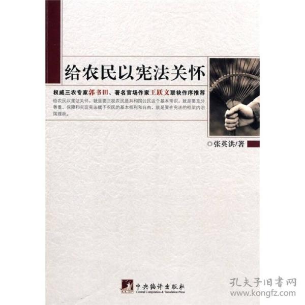 《给农民以宪法关怀》鲜明地将农民与宪法联结起来,以宪法视角集中讨论了当代中国农村和农民诸问题,拓展了农民问题研究的新视野,提升了农民问题研究的新境界。农民是共和国公民,必须使农民充分享有宪法赋予的基本权利和自由。宪法的基本功能在于,通过约束公共权力和保障公民权利,实现社会公正和谐与国家长治久安。《给农民以宪法关怀》认为,解决中国农民问题,不能无视治国安邦的总章程,不能忽视人类政