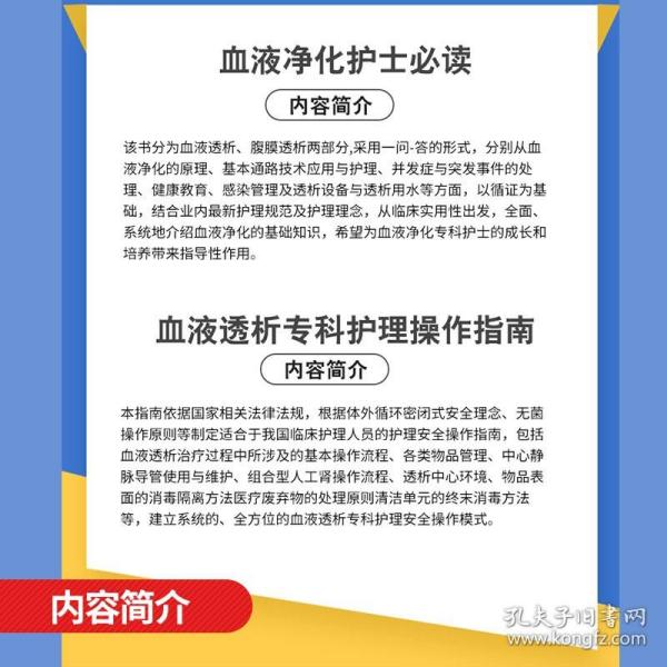 沈霞、杨俊伟编著的《血液净化中心护士手册》紧扣2012年卫生部及江苏省卫生厅等级医院的评审标准,由常年工作在血液净化一线的医护人员编写。《血液净化中心护士手册》内容涵盖血液净化专科护理人员的职责,专科护理常规、工作制度、应急预案、标准化作业程序及考核标准等多个方面,内容翔实,形式简练,可操作性强,适合血液净化中心和肾内科医护人员查阅和学习。