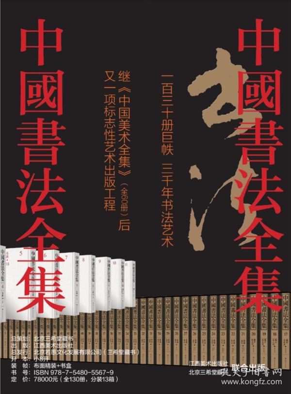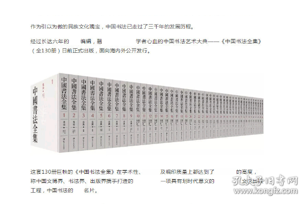 中国书法全集》(全130 册)是一部汇集中国三千年书法艺术精品的大型图集,全彩印刷,收录作 品上起商周,下迄民国,囊括了甲骨、金文、汉简、碑刻、法书、法帖等历代名家真迹和书法精品, 计书家870 位,作品5764 件,图版32000 余幅,书家小传及释文300 余万字,是迄今出版规模最大、 收录作品*全、出版规格*最高的书法艺术集大成之作,堪称我国三千年书法艺术发展的“大百科全书”。