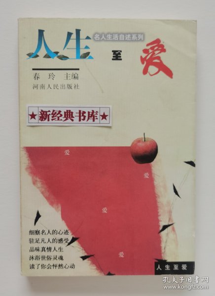 一版一印。《人生至爱》精选了巴金、冰心、朱自清、萧乾、贾平凹、乔叶、李凖、梁晓声、史铁生、丰子恺、傅雷、毕淑敏、肖复兴、刘湛秋、赵丽宏、老鬼、三毛、周国平、张晓风、斯妤等当代著名作家的散文诗、随笔精品,细查名人的心迹,驻足凡人的感受,品味真情人生,沐浴世俗灵魂,读了会让你会怦然心动。