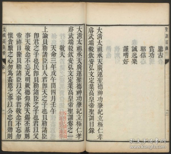 太祖高皇帝努尔哈赤圣训、太宗文皇帝皇太极圣训、世祖章皇帝顺治圣训,清朝开国三帝圣训,圣训强化清朝皇统加入中原政统系列的合法性,深化清朝统治的道统合法性,构造出君师合一的新政治文化语境。《太祖高皇帝圣训》4卷,以言系事,分为26门,共92则,所拟门类称名,凡体现思想要旨者,皆与儒家圣王期待一致,俨然出自圣明天子,气象较边地雄长仁和高远。意在将努尔哈赤塑造为儒家政治文化尺度下的圣王。仔细阅读,也有不同