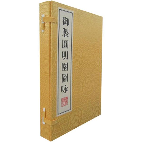《御制圆明园图咏》清高宗弘历撰文,乾隆间内府刻本。《御制圆明园图咏》内容、体例均仿康熙皇帝《御制避暑山庄三十六景诗》一书,收录乾隆皇帝为圆明园景观所作的诗、词作品。全书共收录四十景,每一景绘图一幅,并有御制诗一首,诗中夹注;诗题后有小序,对景点作简介。《御制圆明园图咏》全书体例严谨,写、刻、绘俱精,是典型的内府刻本。  《御制圆明园图咏》共分上下两卷,每卷收二十景。卷首有《世宗