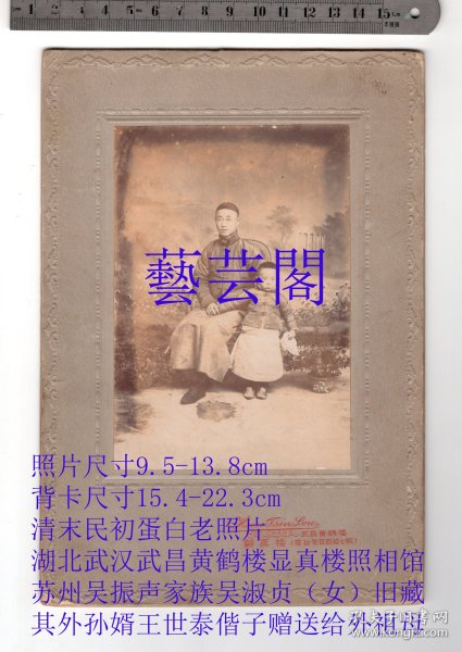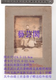 作者 清末民初蛋白老照片,湖北武汉武昌黄鹤楼显真楼照相馆底板,苏州吴振声家族吴淑贞(女)旧藏,其外孙婿王世泰偕子赠送给外祖母的老親照片,背面有民国四年的毛笔字题跋,老照片尺寸9.5-13.8cm背卡尺寸15.4-22.3cm,详情见图片。