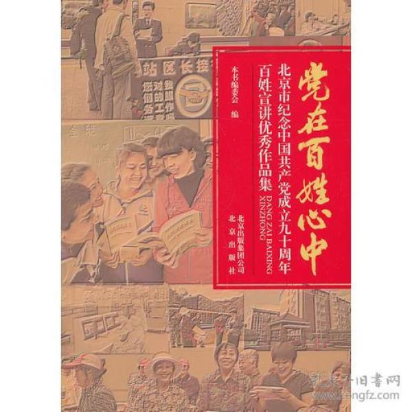 《党在百姓心中:北京市纪念中国共产党成立九十周年百姓宣讲优秀作品集》以纪念建党90周年为契机,以党的历史为生动教材,以老百姓亲闻、亲见、亲历,讲述党的辉煌历程和丰功伟绩,讲述党的优良传统和宝贵经验,讲述党的基层组织和普通党员奋斗、奉献、为民、爱民的真实故事,可以使学习党的历史、党的知识、党的理论更加生动活泼,更加贴近实际、贴近生活、贴近群众。