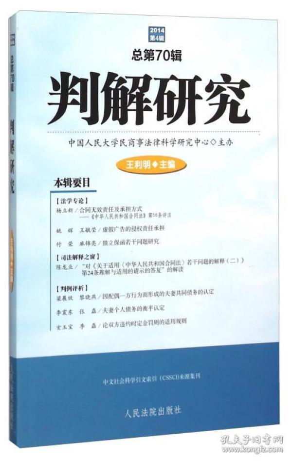 《判解研究(2014第4辑总第70辑)》收录了陈龙业:“对《关于适用〈中华人民共和国合同法〉若干问题的解释(二)》第24条理解与适用的请示的答复”的解读,杨立新:《合同无效责任及承担方式——〈中华人民共和国合同法〉第58条评注》,梁展欣、黎晓燕:《因配偶一方行为而形成的夫妻共同债务的认定》等法官及学者的稿件共14篇,从不同视角论述了当今审判实务和理论研究中的热点问题,所选文章均