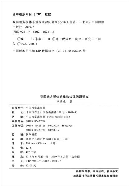 《我国地方税体系重构法律问题研究》主要内容包括导论,地方治理与地方税体系的关系,我国地方税制演变的历史脉络,地方税权配置与地方税体系形成,我国地方财政收支划分与结构,域外国家(地区)地方税体系构建基本制度,税收法定原则与地方税立法权,构建地方税体系的原则与思路,参考文献。   李玉虎,法学博士,西南政法大学经