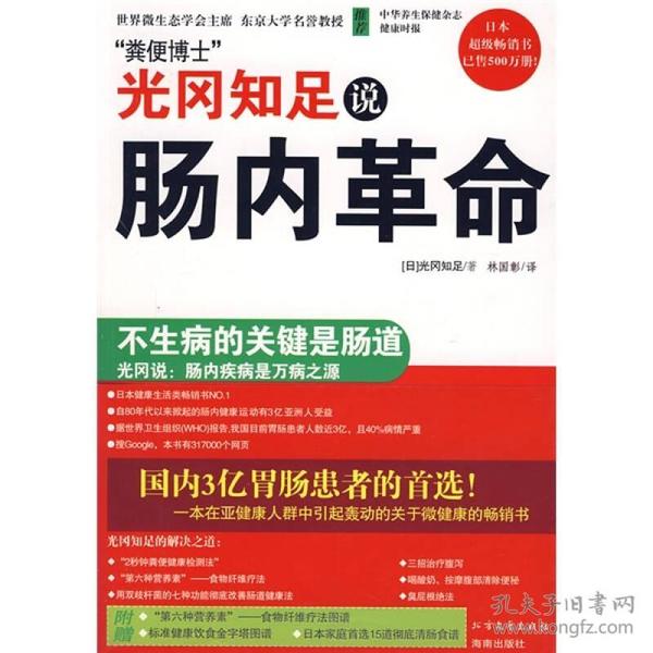 其实是人体健康的测量计,一个人的健康程度可以从大便的气味、形状、颜色等来判断;肠道疾病是“万病之源”,健康的身体应从肠道健康开始,并告诉我们肠道是如何被污染的,年轻女性的皮肤如何受便秘的影响,如何用简易的方法检测自己的健康状况,以及如何使肠道保持健康。对于那些爱美的女性,光冈知足则建议:要想容貌年轻美丽,首先要做个“肠内美人”,肠舒才能人美。