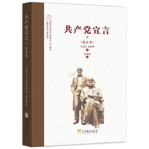 《共产党宣言》是马克思和恩格斯为共产主义者同盟起草的纲领,全文贯穿马克思主义的历史观,是马克思主义诞生的重要标志。由马克思和恩格斯执笔写成 。1848年2月21日在伦敦次以单行本问世。2月24日,《共产党宣言》正式出版。1920年8月,由陈望道翻译的首个《共产党宣言》中文全译本在上海出版。《陈望道译(校注本)》对陈望道译翻译的《共产党宣言》中与今天的译法出入较大的人名、地名、专