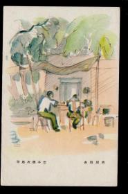 出版社 大日本印刷株式会社发行出版1940便明信片收藏邮品 发信中支派遣月第七三九五部队东芝直治 收件日本兵库县武库郡鸣尾村东芝东,立,毅,战地画作,1937年7月7日军官兵在宛平西龙王庙永定河边指挥石景山画眉山,日军中画家秋声写沟桥
