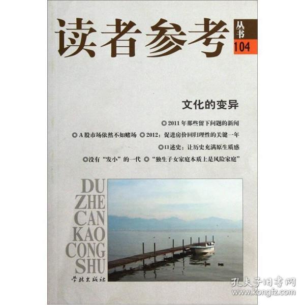 《文化的变异》为“读者参考丛书”之一,为综合类文摘读物。秉持“家事国事天下事,事事关己;信息知识观念,须时时更新”的编辑理念,以有用、有趣、有品的内容,满足读者的多方面阅读需求。内容包括:2011年那些留下问号的新闻;中央预算是怎么“算”的;2012:促进房价回归理性的关键一年;“剩女”被剩的九个原因等。