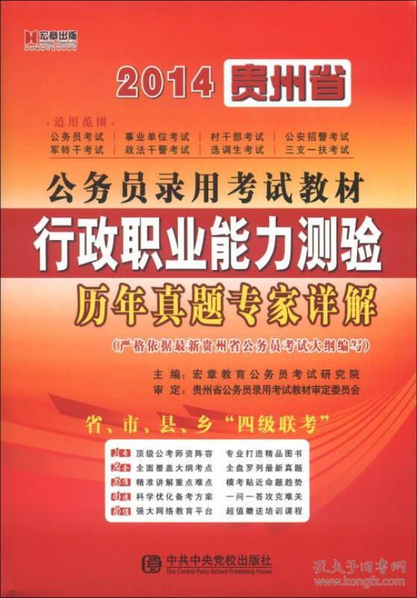 《宏章出版·2014贵州省公务员录用考试教材:行政职业能力测验历年真题专家详解》顶级公考师资阵容,专业打造精品图书,全面覆盖大纲考点,全盘罗列最新真题,精准讲解重点难点,模考贴近命题趋势,科学优化备考方案,一问一答攻克难关,强大网络教育平台,超值赠送培训课程。