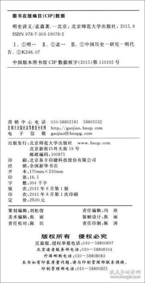 《明史讲义》是孟森先生20世纪30年代初在北京大学授课时的讲义。孟森先生在北京大学历史系所授课程为明清史,分作两年轮授,今年明史,翌年清史。讲义也分作明史、清史两部。明史讲义全书分为二编:一编总论明史在史学上的地位和明史体例;第二编分为《开国》、《靖难》、《夺门》、《议礼》、《万历之荒怠》、《天崇两朝乱亡之炯鉴》、《南明之颠沛》七章,对明朝各个时期的史实进行了高度概括,见识高远