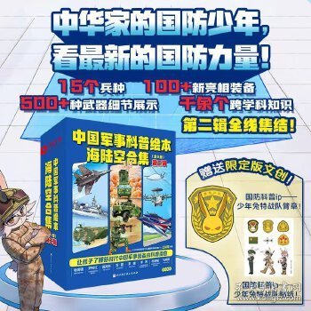 市场首套“中国军事科普绘本”全面改版升级!加入新航母和海军舰艇,换装最新作训服、新涂装。500余幅手绘大图剖析装备结构。15个兵种、100余种新装备、多种任务场景、千余知识点,让孩子了解国防知识。