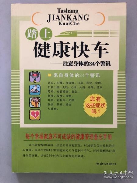 踏上健康快车:注意身体的24个警讯 原版书 作者孙捷 著 出版社国际文化出版公司 出版时间2003 版次我来补充 ISBN7801731328或9787801731326