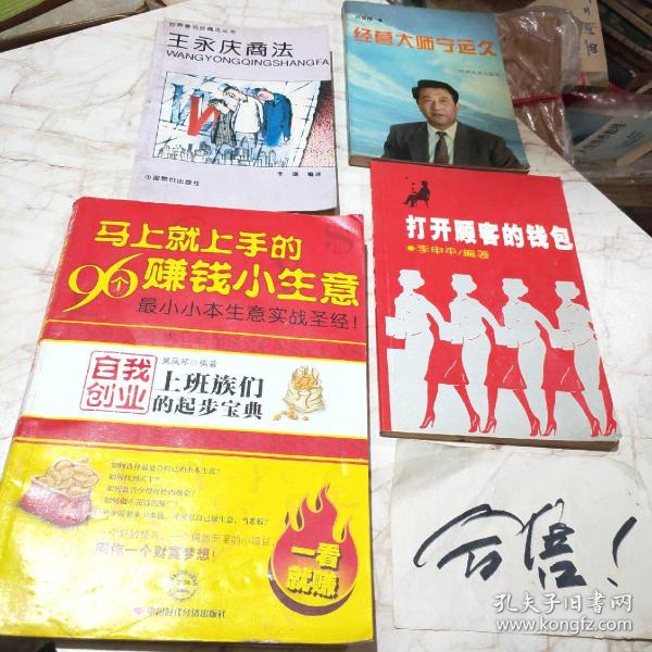 4本合售价:打开顾客的钱包(李申平.满庭出版社)、王永庆商法(李璜.中国物价出版社)、经营大师宁运久(孙鸷翔.中国发展出版社)、马上就上手的96个赚钱小生意(最小小本生意实战圣经!)