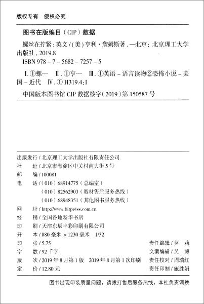 正版 螺丝在拧紧(纯英文版)9787568272575(美)亨利*詹姆斯|总主