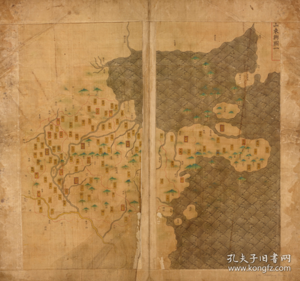 【提供资料信息服务】明代《山东省舆图》(原图高清复制)济南青岛淄博枣庄东营烟台潍坊济宁泰安威海日照滨州德州聊城临沂菏泽莱芜登州成山文登栖霞招远即墨平度昌邑高密诸城武定沾化利津青城济阳商河临邑德平禹城高唐夏津武城青平馆陶冠县朝城范县阳谷郓城汶上嘉祥巨野定陶单县曹县郯城蒙阴沂水肥城济南长清淄川临淄寿光,图中包含明山东省省各府县地名,珍贵史料 老地图。裱框之后,风貌佳。