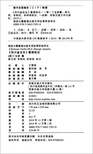 《四川盐法志》是清代后期四川总督丁宝桢总纂的盐政志书,《整理校注》内容丰富,体例严谨,以文图表等方式记述了从先秦到清光绪初年四川盐业发展的历史。整理校注《整理校注》对于了解古代四川盐业发展历史、研究中国盐文化以及弘扬中华优秀传统文化都具有重要学术价值,同时对于研究四川特色历史文化“井盐文化”,实施文化强省和文旅融合发展文化旅游产业也具有重要现实意义。