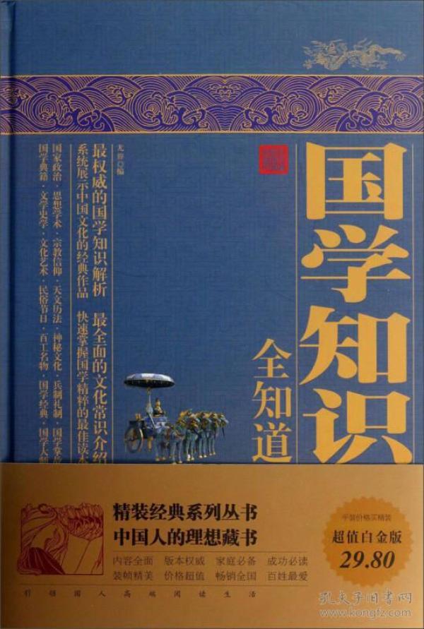 中华国学博大精深,包罗万象,是数千年来中国人思维方式、行为方式、生活方式的高度总结,浸淫着每个中华儿女的血液和灵魂。对每一位国人来说,国学是立身处世之本,更是我们不可或缺的精神力量。在经济全球化的大背景下,作为一个中国人,我们不能不了解国学;作为一个读书人,我们不能不学习本民族的传统文化。,《国学知识全知道》是一部快速了解中国古代文化的百科全书,涵盖了国家政治、思想学术、宗教信