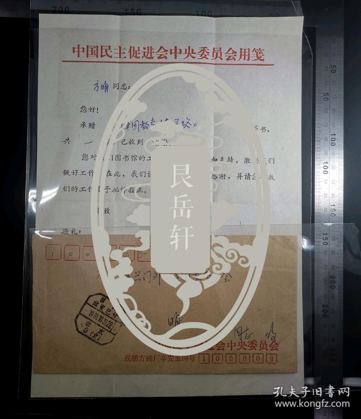 名人信扎:中国民主促进会中央委员会中央图书馆寄给已故著名社会活动家,中国教育工会全国委员会主席方明信札一套,公函封,正面加盖国内游资已付戳,北京-北京,单戳清晰,带原始信扎16开纸一通一页,内容主要是对方明同志捐赠的《为中国教育改革探路》一本表示感谢,落款加盖中国民主促进会中央委员会流通图书馆公章,信纸为中国民主促进会中央委员会用笺,1988.10.31,gyx22205