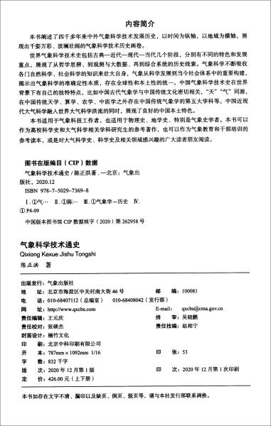 《气象科学技术通史(套装上下册)》阐述了四千多年来中外气象科学技术发展历史,以时间为纵轴,以地域为横轴,展现出千姿万彩、波澜壮阔的气象科学技术历史画卷。世界气象科学技术史包括古典一近代一现代一当代几个阶段,分别有不同的特色和发展重点,展现了从哲学思辨、到观测与大数据、再到综合系统的历史线索。气象科学不断吸收各门自然科学、社会科学的知识来壮大自身,气象从科学发展到当今社会体系中的