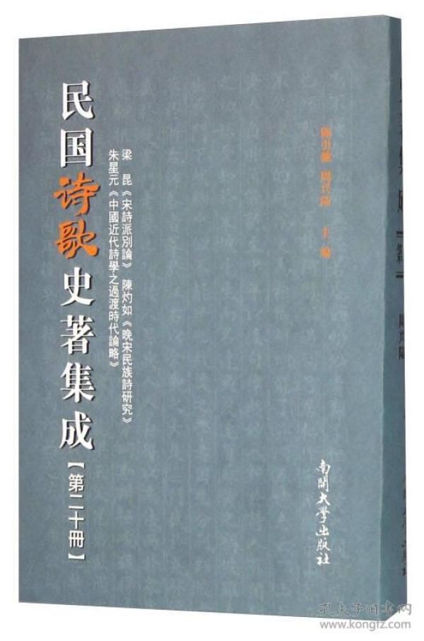 《民国诗歌史著集成(第20册 梁昆宋诗派别论陈灼如晚宋民族诗研究朱星元中国近代诗学之过渡时代论略)》包括《宋诗派别论》、《晚宋民族诗研究》、《中国近代诗学之过渡时代论略》三册。《宋诗派别论》是一部以派别视角研究宋诗的现代论著。《晚宋民族诗研究》为作者二十三岁所作,有感于日寇亦步步紧逼之时局,实借晚宋爱国诗人之酒杯,浇自我之块垒。