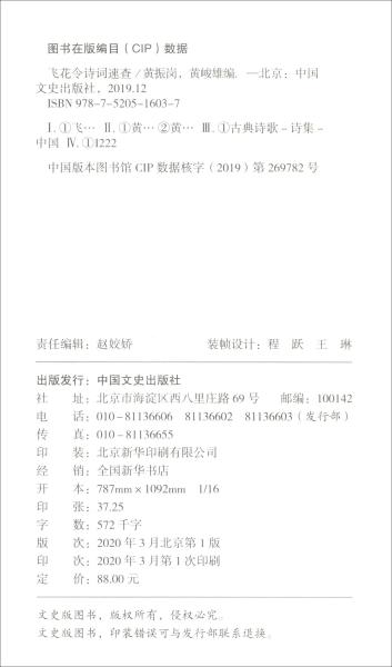 《飞花令诗词速查》主要取材于(清)蘅塘退士编的《唐诗三百首》和(清)上疆村民(朱孝臧)编的《宋词三百首》,此二书为举世公认的名篇。另外,宋诗在近人钱锺书选编的《宋诗选注》和金性尧选编的《宋诗三百首》中选取;诗经、两汉、魏晋南北朝和金元明清的诗在近人林庚、冯沅君主编的《中国历代诗歌选》中选取;唐、五代词和《宋词三百首》以外的宋词在近人龙榆生编选的《唐宋名家词选》中选取;晚明和清词