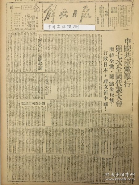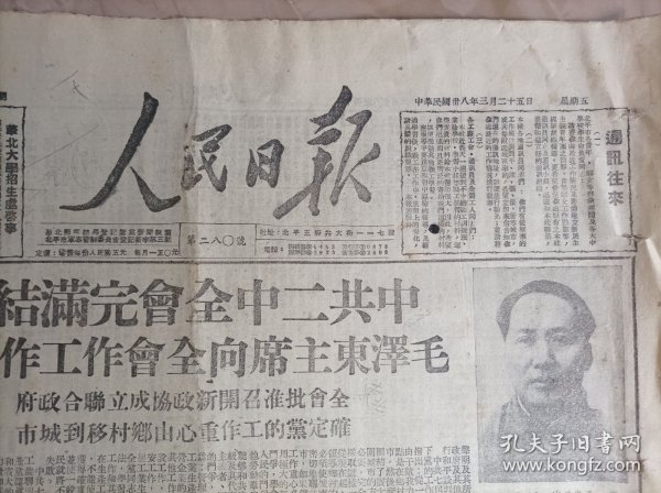 出版社 中共二中全会完满结束毛泽东主席向全会作工作报告全会批准召开新政协成立联合政府确定党的工作重心由乡村移到城市。头版毛泽东主席照片