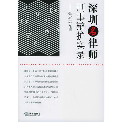律师是社会的法律工作者,是我国社会主义现代化建设和民主法制建设的重要力量。律师的职责和使命,就是要维护当事人的合法权益,维护法律的正确实施,维护社会的公平正义。“铁肩担道义”,是时代对律师的要求,也是人民对律师的期盼。,法律出版社编辑出版《深圳名律师刑事辩护实录》是一件很有实际意义、令人感到欣慰的事情。它给律师同行相互交流,搭建了一个很好的平台,通过本书使社会各界了解律师是怎样