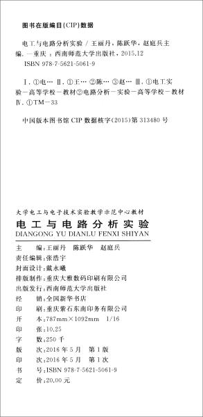 全新正版 封面册数以在售版本为准 电工与电路分析实验 9787562150619西南师范大学出版社 主编王丽丹, 陈跃华, 赵庭兵 定价20
